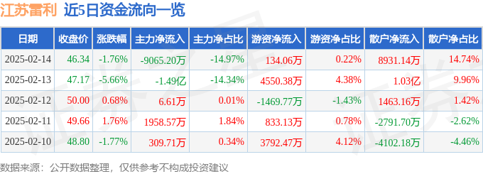 股票行情快报:江苏雷利(300660)2月14日主力资金净卖出9065.20万元
